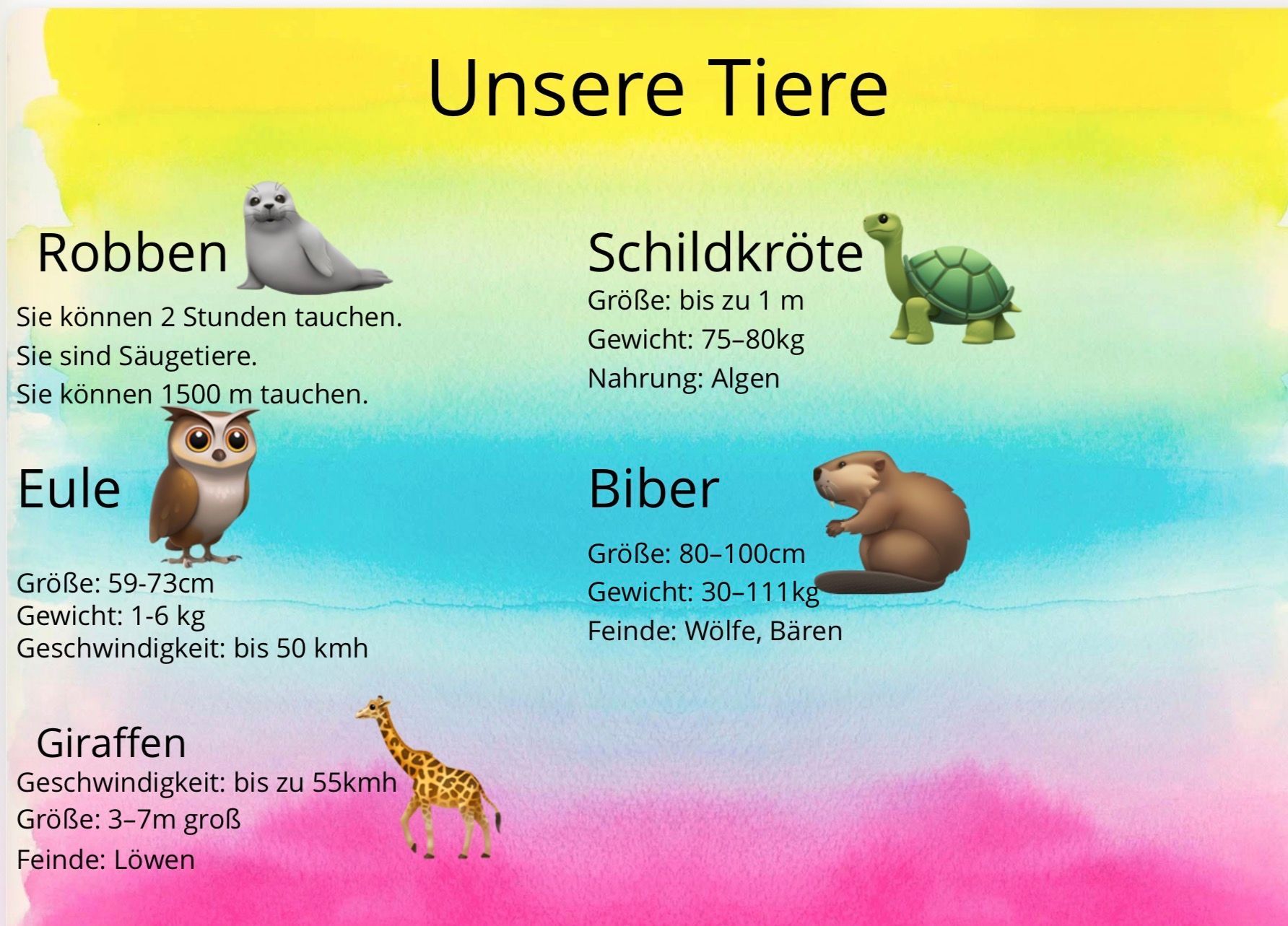 Die Klassen heißen: Delfine,Füchse,Schildkröten,Biber,Waschbären,Eulen,